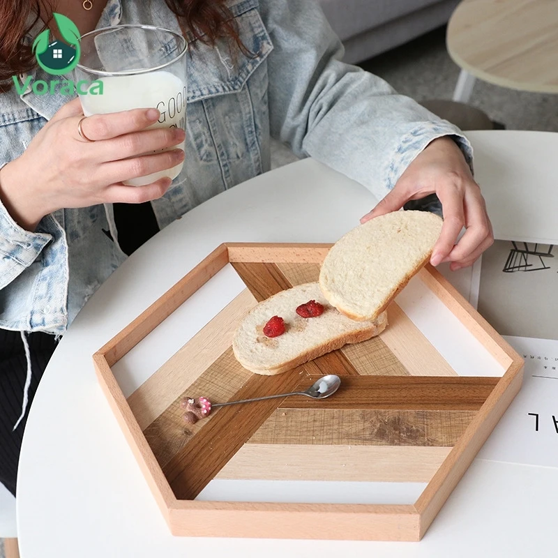 ORIGINAL Wooden Hexagonal Serving Tray Decorative Wood Plate Tea Dessert Bread Trays Food Server Dishes Home